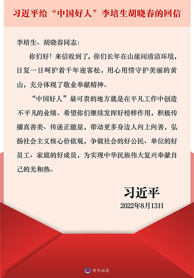 2008年起,中央文明辦組織開展網(wǎng)上“我推薦我評議身邊好人”活動,至今已發(fā)布“中國好人榜”150期,共有16228人(組)入選“中國好人”。李培生、胡曉春在黃山風景區(qū)分別從事環(huán)衛(wèi)保潔和迎客松守護工作,2012年和2021年先后入選敬業(yè)奉獻類“中國好人”。近日,李培生、胡曉春給習近平總書記寫信,匯報工作情況和心得體會,表達了為守護美麗黃山、建設(shè)美麗中國貢獻力量的決心。
