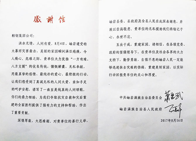 越是在大的災害面前,越能彰顯大企業(yè)的風范與擔當。8月初,岫巖遭遇有氣象記錄以來最強降水襲擊,全境受災,鞍鋼集團心系災區(qū)人民,全力以赴幫助岫巖人民搶險重建,贏得當?shù)卣腿嗣袢罕姷膹V泛贊譽。8月16日,岫巖縣委、縣政府給鞍鋼集團發(fā)來感謝信,感謝鞍鋼集團的無私援助,并向鞍鋼集團致以崇高敬意。