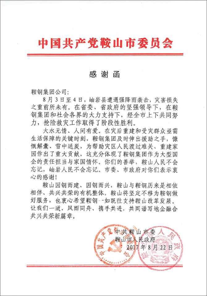 受臺風“海棠”及北方冷空氣共同影響,岫巖縣從8月3日開始遭遇有氣象記錄以來最強降水襲擊,造成全縣26個鄉(xiāng)鎮(zhèn)、街道全部受災,災情之重前所未有。災害發(fā)生后,鞍鋼集團高度重視,集團公司有關領導多次與鞍山市委、市政府相關領導溝通,了解地方政府搶險救災工作進展以及急需的人力、物資情況。鞍鋼集團先后派出兩批共65臺套大型施工設備、100余名搶險人員,趕赴受災最嚴重的村鎮(zhèn)搶險救災。鞍山鋼鐵代表鞍鋼集團捐款500萬元,用于岫巖縣抗洪搶險、救災扶貧,鞍鋼集團的善舉得到了當地政府和人民群眾的廣泛贊譽。8月16日,岫巖縣委、縣政府專門給鞍鋼集團發(fā)來感謝信。