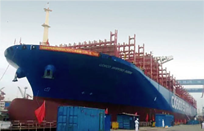 此次成功下水的集裝箱船是我國首次自主設(shè)計建造、材料全部國產(chǎn)化的首艘20000箱超大集裝箱船,也是目前國內(nèi)船廠能夠建造的最大級別集裝箱船。該船總長399.9米,型寬58.6米,型深33.5米,大約相當(dāng)于4個足球場縱向并列布置大小。用于10000箱以上超大型集裝箱船關(guān)鍵部位的高強(qiáng)超厚止裂鋼板,是目前船體結(jié)構(gòu)用鋼中技術(shù)指標(biāo)最高、生產(chǎn)難度最大的品種。而由鞍鋼獨(dú)家供貨的船體關(guān)鍵部位使用的止裂鋼板的設(shè)計成品規(guī)格也創(chuàng)下了世界之最——鋼板最大厚度為85毫米,最寬板幅達(dá)4150毫米、成品鋼板長度為17900毫米,成品鋼板最大單重達(dá)到26噸。