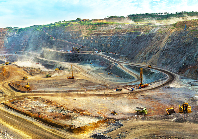 黛青色的山脈籠罩在初升的霞光里,一輛輛滿載礦石的“電動輪”在山路上盤旋,一架架鉆機忙碌而有序地作業(yè),一臺臺電鏟在鏟位上,不停地挖掘礦石,在霞光的輝映下,礦石折射出一閃一閃的銀光。