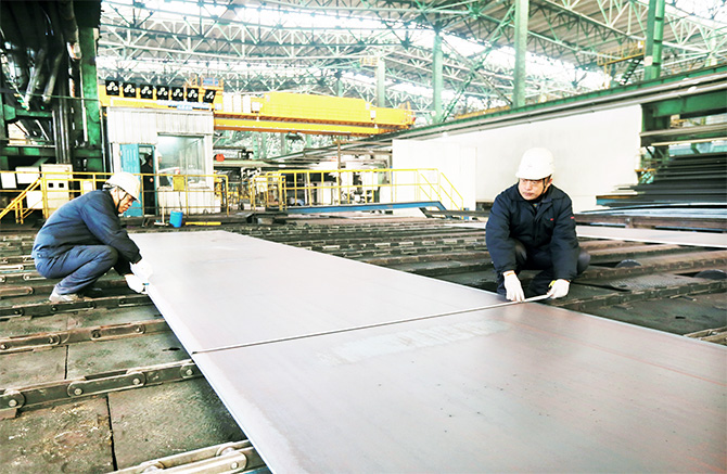 鞍鋼股份中厚板廠厚板線職工正在檢查鋼板質(zhì)量