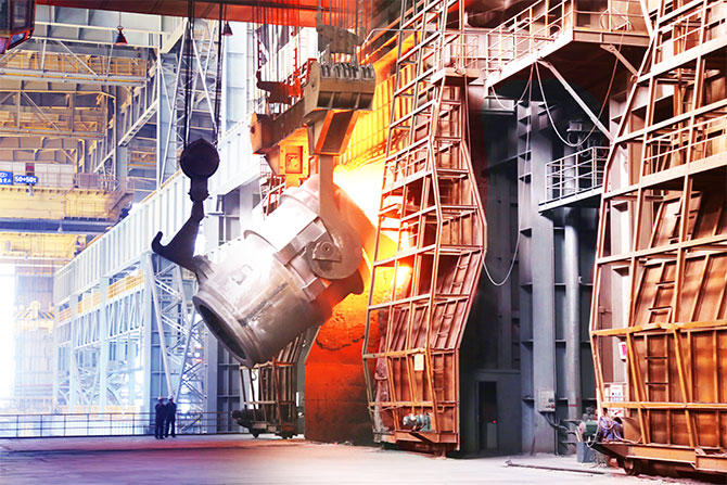 鞍鋼股份煉鋼總廠三分廠轉(zhuǎn)爐前正在進(jìn)行兌鐵水作業(yè)