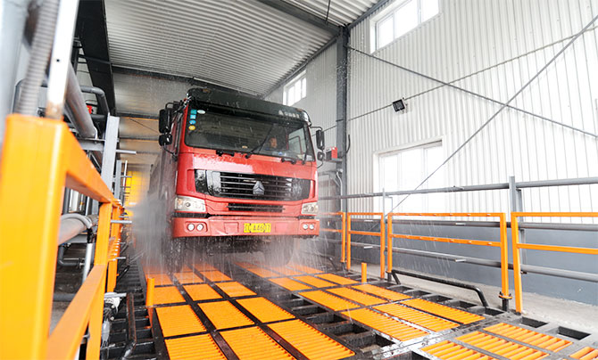 從料場(chǎng)裝料的運(yùn)輸車輛駛?cè)胂窜嚺_(tái)后,進(jìn)行噴淋清洗和烘干,再?gòu)某隹隈偝?。洗車后的廢水進(jìn)入沉淀池沉淀后循環(huán)使用,無(wú)外排廢水。洗車臺(tái)的投入使用,可有效解決運(yùn)輸車輛揚(yáng)塵問(wèn)題,改善廠區(qū)道路環(huán)境。