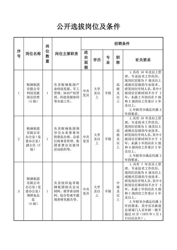 根據(jù)工作需要,鞍鋼集團有限公司(以下簡稱鞍鋼集團)黨委決定在全公司范圍內(nèi)公開選拔鞍鋼集團總部部門領(lǐng)導(dǎo)人員人選3名,歡迎符合條件的人員和廣大職工積極參與和監(jiān)督。