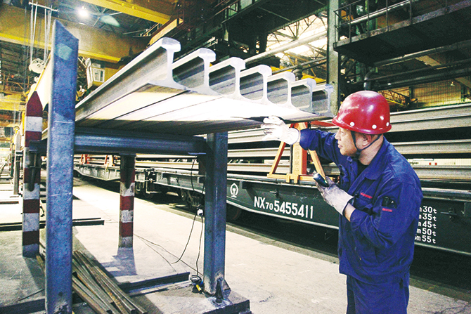 鞍鋼股份大型廠軌梁分廠職工正在對即將銷往國外的重軌進行表面質(zhì)量檢查