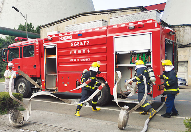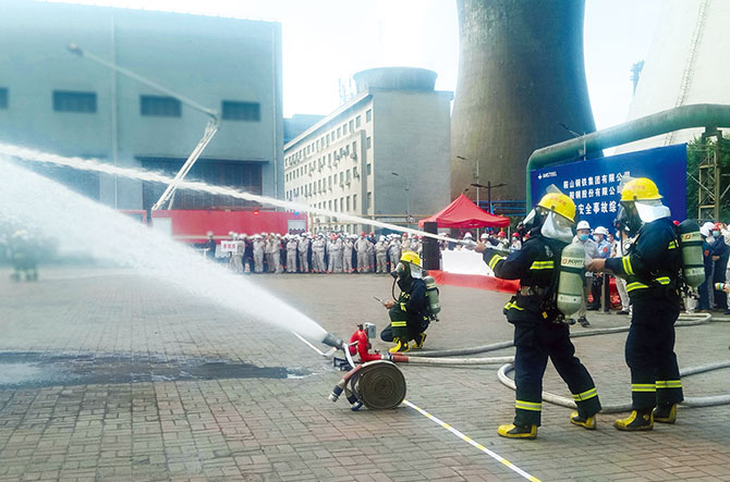 雖不是實戰(zhàn),但參演職工人人保持臨戰(zhàn)狀態(tài)。煤氣事故的“搶險”剛剛結(jié)束,其下部煤氣排水器火勢蔓延。現(xiàn)場檢修人員快速反應(yīng)、沉著應(yīng)對,帶著滅火器一路狂奔至著火區(qū)域合力圍剿火龍;消防隊員第一時間趕至現(xiàn)場,分工明確、協(xié)同作戰(zhàn),手握水槍,直擊火源,場面非常震撼。