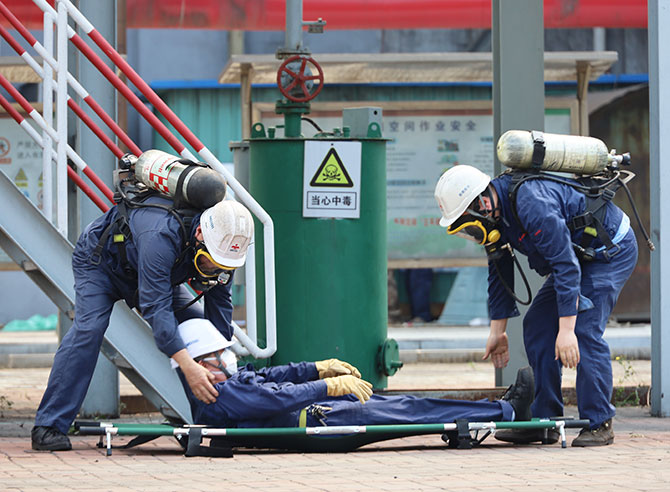 雖然是演練,救援人員認真對待每一個環(huán)節(jié)——帶好空氣呼吸器,將“中毒”職工抬到安全區(qū)域進行“急救”;觀察中毒表現(xiàn),對2名中毒者進行心肺復(fù)蘇和蘇生器補氧救助;停煤氣、關(guān)閥門,吹氮氣、做化驗,檢測恢復(fù)泄露設(shè)備。