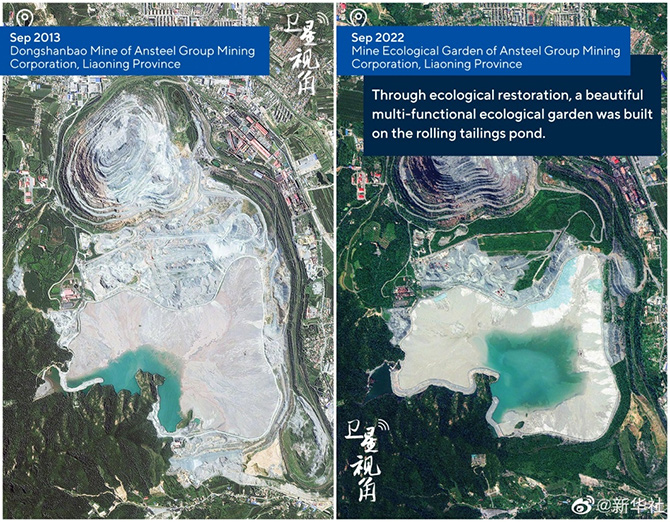 該組衛(wèi)星對(duì)比圖顯示了2013年9月鞍鋼集團(tuán)礦業(yè)有限公司大孤山鐵礦東山包尾礦庫和2022年9月鞍鋼集團(tuán)礦業(yè)有限公司的礦山生態(tài)園。在該組衛(wèi)星對(duì)比圖上可以清晰地看到,鞍鋼集團(tuán)通過生態(tài)修復(fù),已經(jīng)把昔日尾礦庫改建成一個(gè)風(fēng)光綺麗的多功能生態(tài)園。
