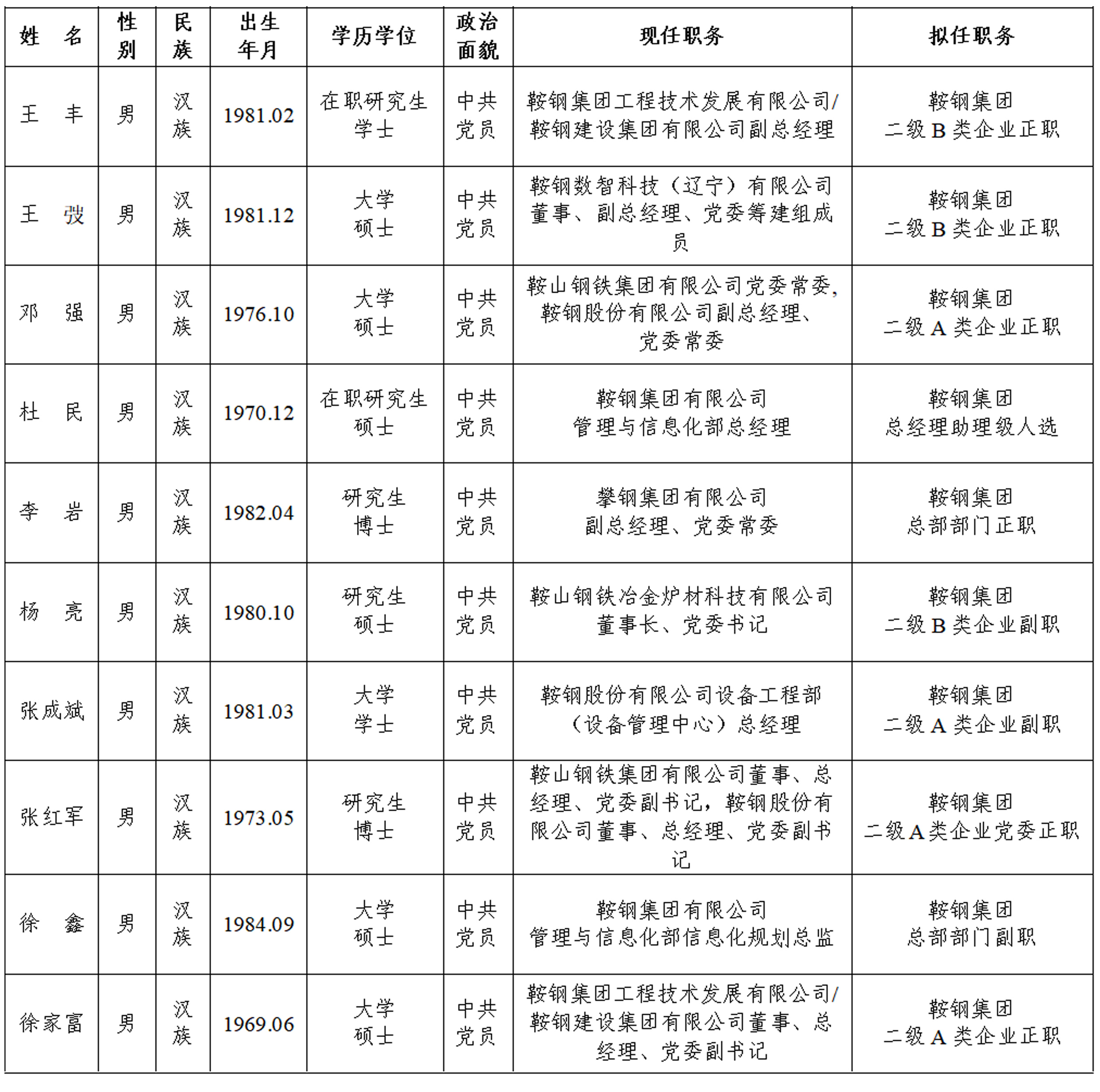 鞍鋼集團有限公司10名擬任職領導人員名單
